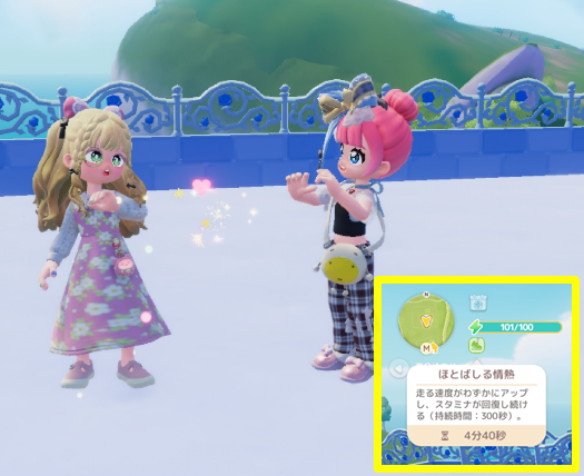 前にも触れた気がしますが、誰かからハートを投げるエモしてもらうと、5分間バフがつきます。足早くなってスタミナ回復もするので、虫取りクエストなどに便利