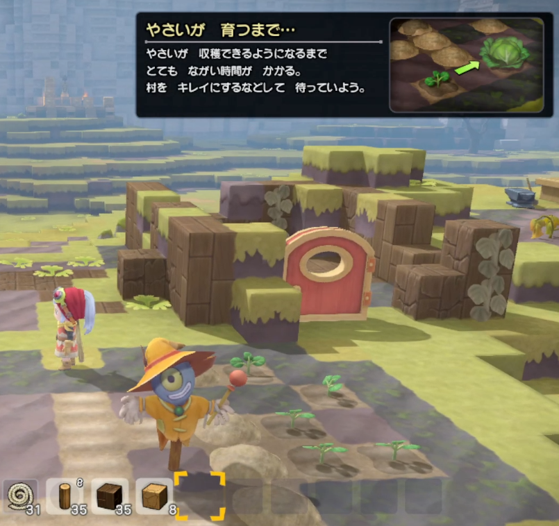 設置すると、かかしを中心とした周囲9×9マス内にある土ブロックを畑と判定し、農民が土を耕すようになります。後に作成できる柵等で囲うと4~150マス以内で自在の形で畑を作ることができます。物語後半になると作物を指定することで農民が種まき、収穫をしてくれるようになります。