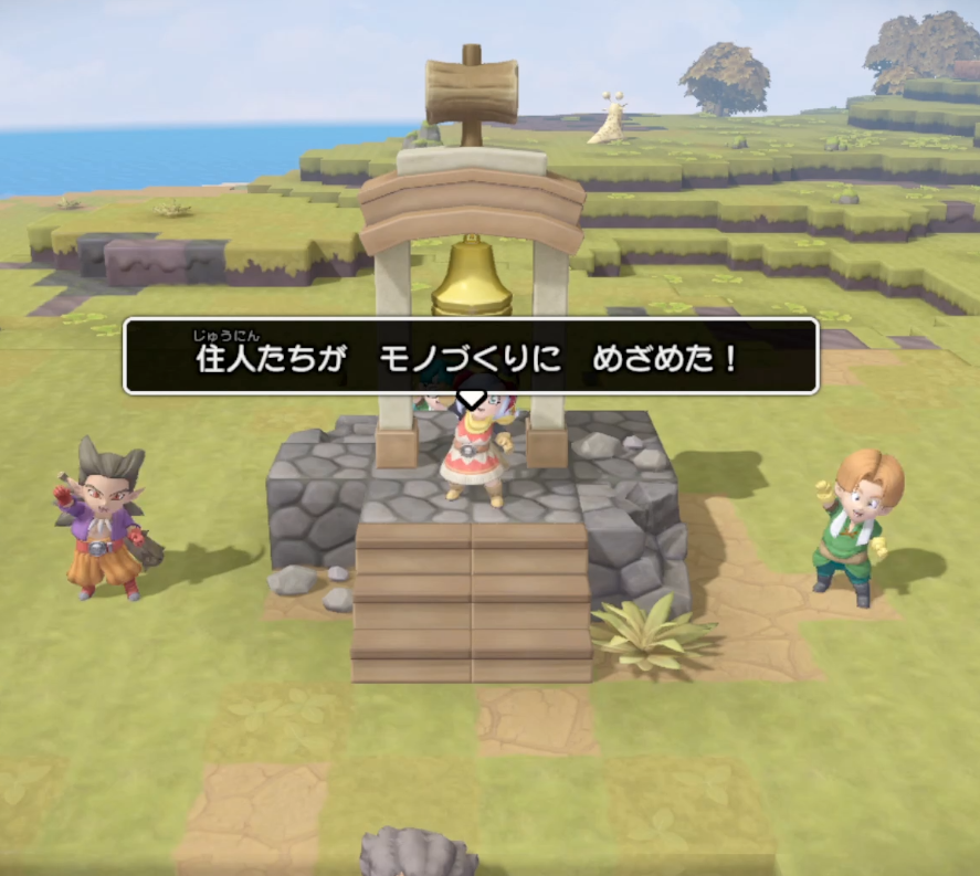 鳴らすとビルドLvというものがあがり、住人たちがモノづくりにめざめます。手前切れてますが反発してたドルトンも手を掲げてます。すごい洗脳威力!