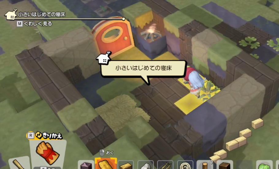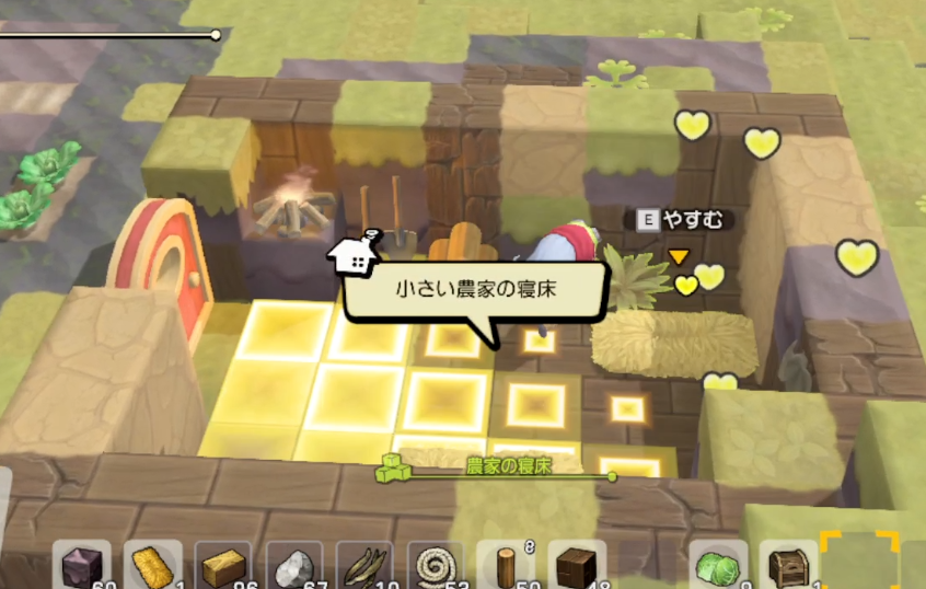 ビルダーズ1では部屋判定の中でしか眠れませんでしたが、2は野宿できます。便利。昼でも眠ることで体力回復するのでわらベッドの持ち歩き推奨。