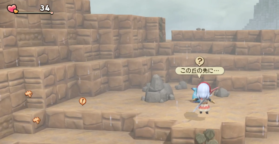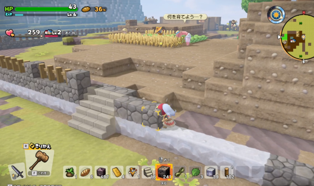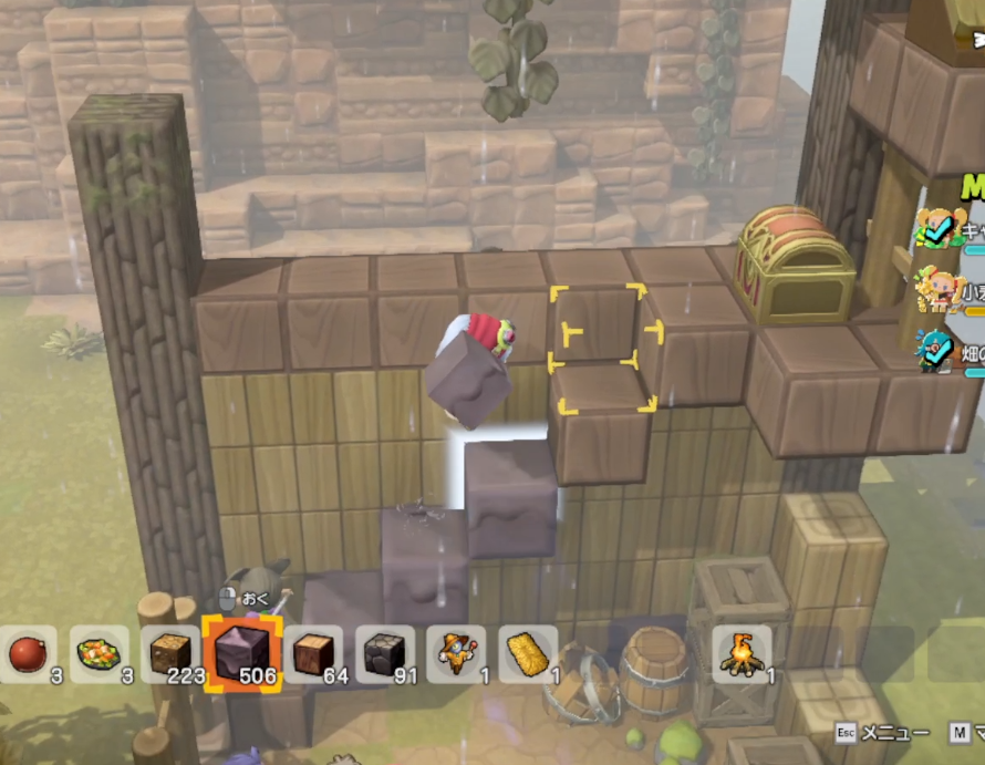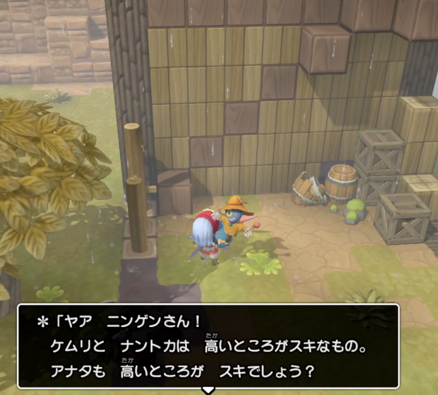 奥側のサブクエスト(おおねずみ)は高いところに登るチュートリアル。ブロックならなんでもいいので、色違いのブロックに合わせて階段状に設置することでクリア
