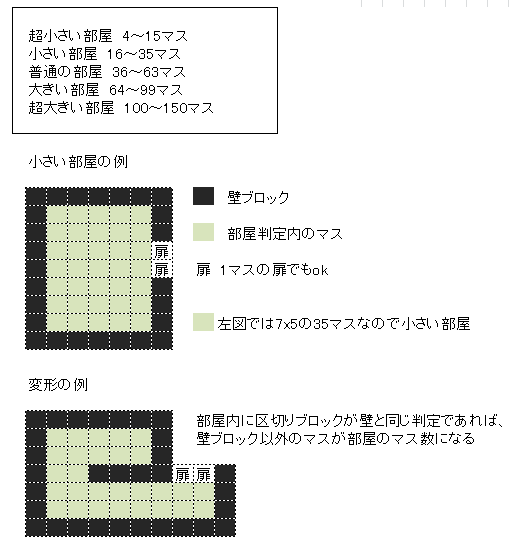 ヒースの依頼は、農家の倉庫を「ちいさな部屋」で作ること。部屋には大きさの概念があり、部屋判定内のマスの数に応じて5段階にわかれています。