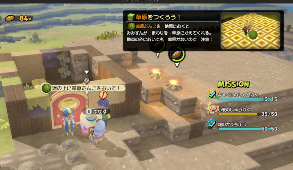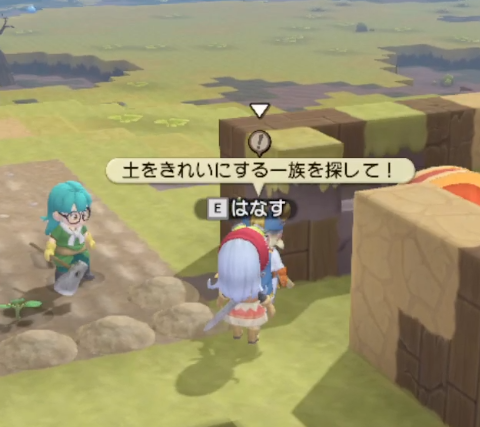 お次は、みみずんの依頼。ヒースも同時にきましたが、あとでね。依頼内容は草原を作ろうということで、草原だんごを2つくれます。これは土系統のブロックを草原にしてくれる有能なアイテム
