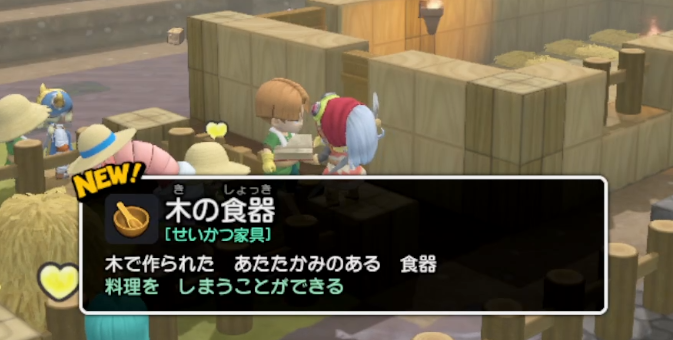 とりあえず依頼達成のため、食事テーブルを設置。野外にただ置いただけで、この感心具合に涙がでます・・・! 特定のアイテムをまとめて設置することで「カタマリ」と判定されます。今回はテーブル系統に食器系統を置き、椅子系統をとなりに置くことで「食事テーブル」の完成