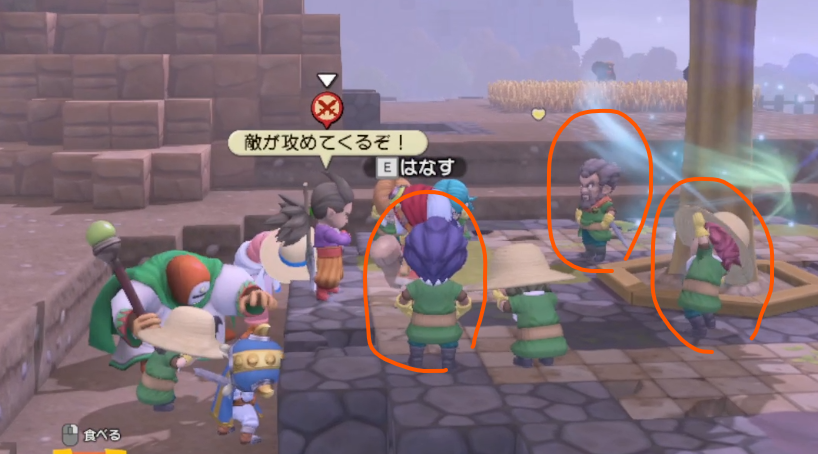 ここで襲撃イベント。シドーくんの頭上に戦闘マークがつくと、住人が集まって襲撃に備えます。怯えている住人は戦わないので、しっかり立ってる住人に武器をもたせるようにします。(ジバコちゃんマークし忘れた)