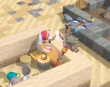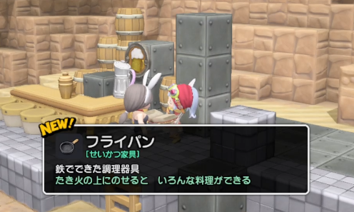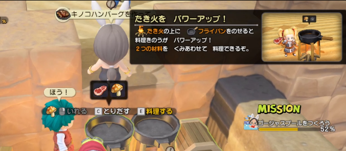 ペロちゃんの依頼で、新しいメニューを作りたいということで素材を2つ入れて料理ができるフライパンをひらめき。たき火にフライパンをのせることでセットとなります。