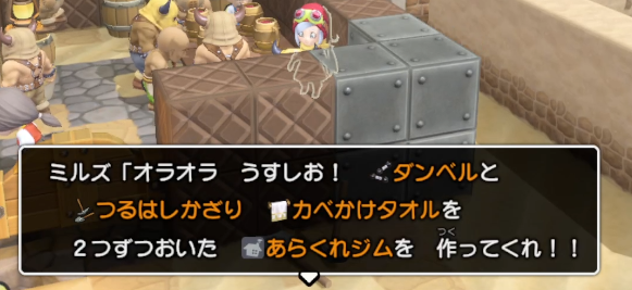 何が足りないのか悩んで、ミルズは筋肉が足りない!とあらくれジムを作る依頼を。