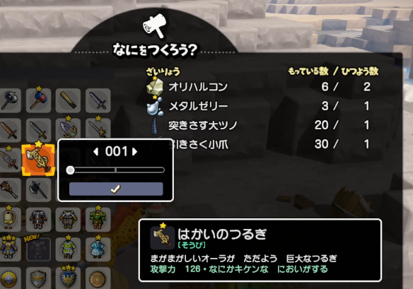 からっぽ島に帰還して、さっそく はかいのつるぎ を作成。