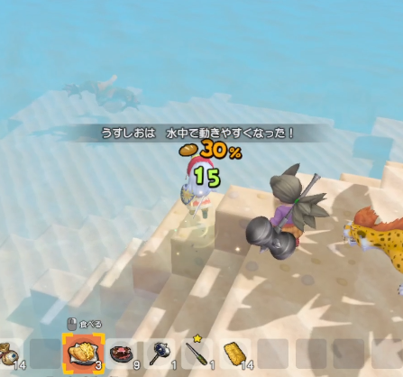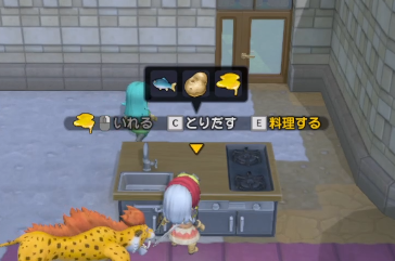 次のそざい島に向けて、周回生はお料理に励みます。フナとかイワシとかの魚とじゃがいも、油でフィッシュ&チップスができます。水中移動が楽になるので5個くらいほしい。