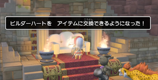 しろじいにクエストマークがつくので、話しかけると、ビルダーハートとアイテムの交換が解放されます。今は不足がちですが、そのうちビルダーハートは余ってきます。