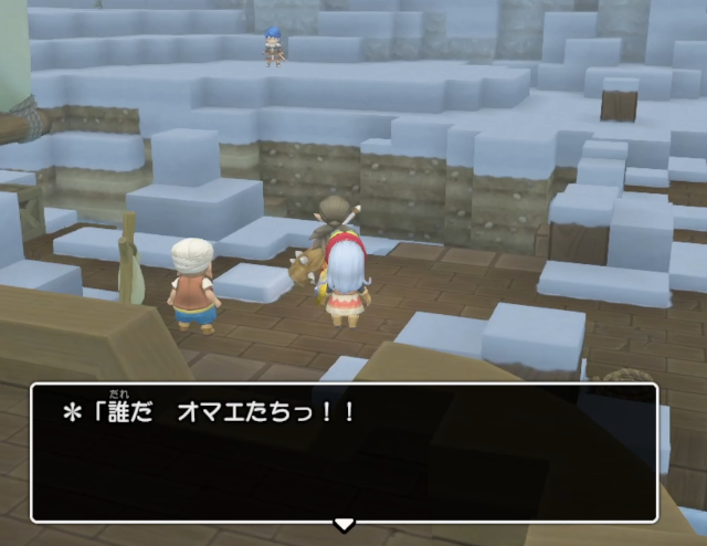 警戒されますが、主人公の顔を見て警戒をゆるめます。ビルダーと名乗るといつも通り驚かれますが、これもいつも通りたのみがあるからついてきてくれと案内されます。
