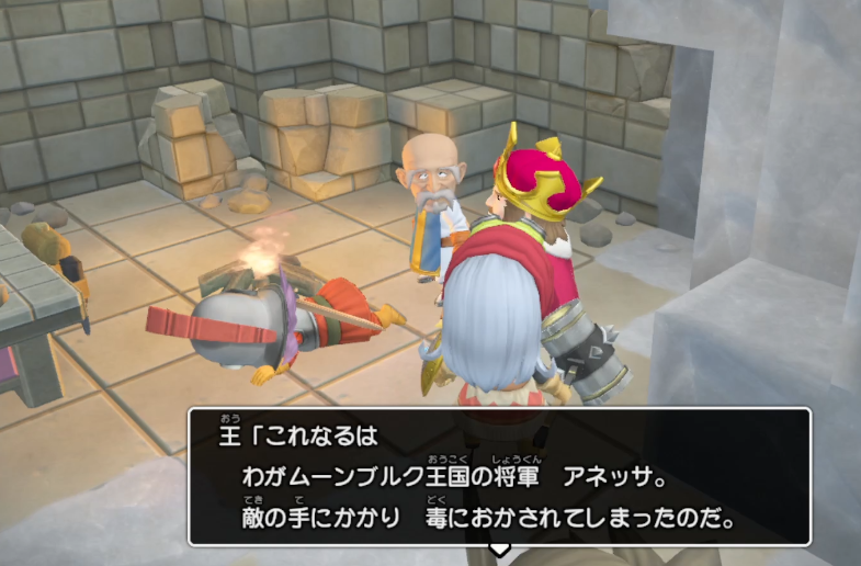 向かった先には、いかにもな王様と老兵士、倒れた女将軍アネッサがいて毒消し草を作る依頼を受けます。道中にある薬葉とにがきのこで作れます。