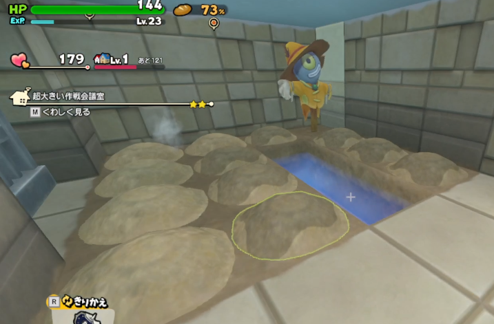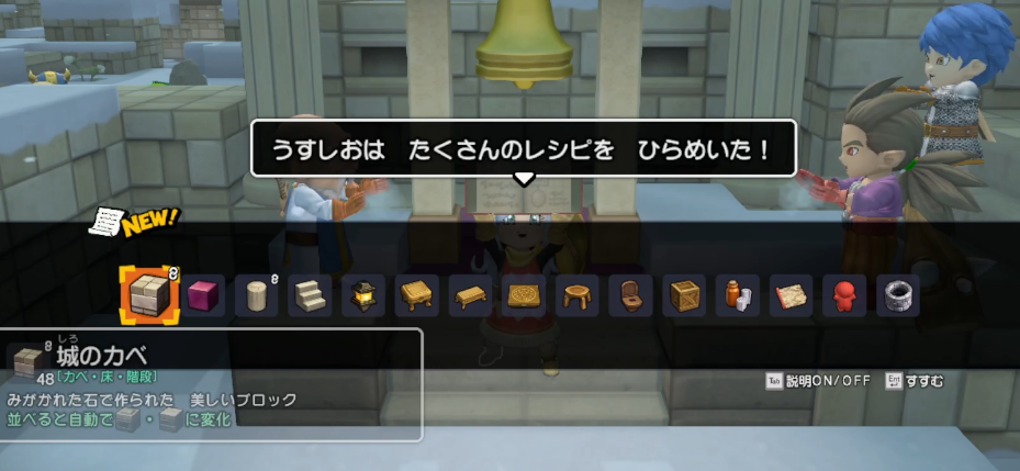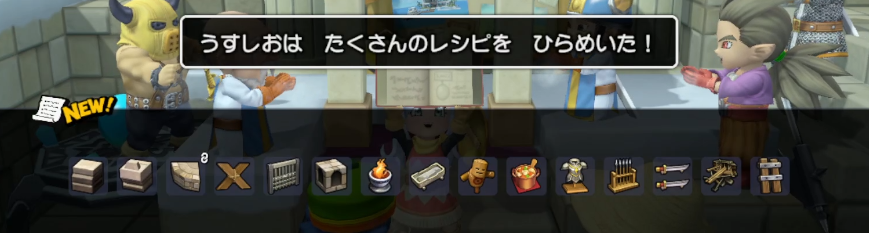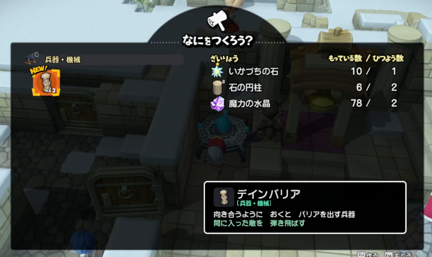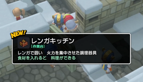 撃退した後、お城のキッチンを作れとのことで、レンガキッチンをひらめきます。3つの素材を入れて料理できるようになります。