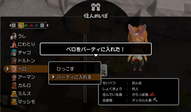 雪原作りでイエティを仲間にするため、そざい島へ向かいますが、いまはシドーくんが仲間にいないので、戦闘要員を任意で仲間にしておきます。