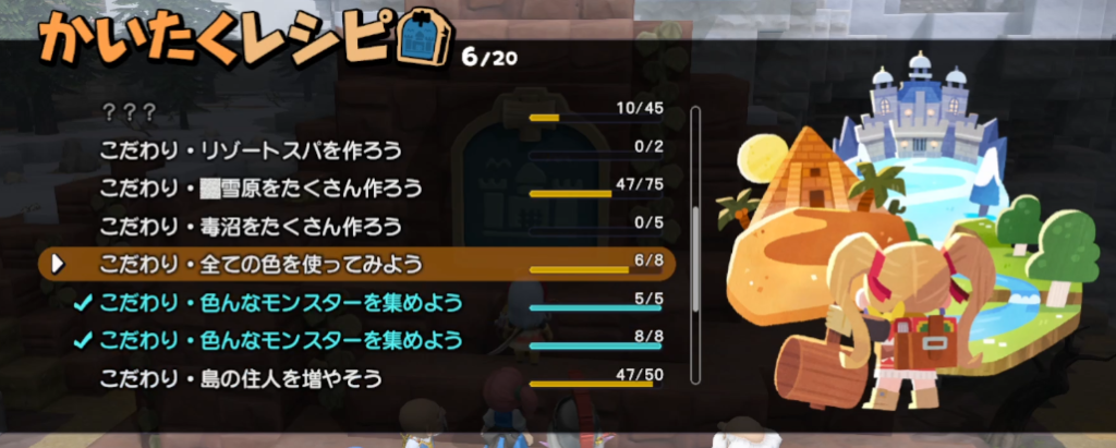 最初のかいたくレシピを達成して石板を調べると、あらたな目標が並びます。