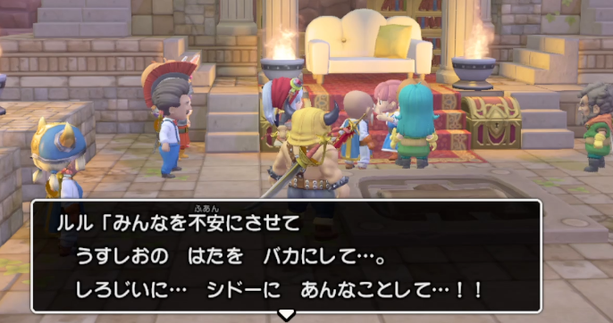 謎の声に苦しむシドーくんのもとに駆けつけるルルちゃん。心配しながらも、いいかげん主人公と仲直りしなさいと地団駄を踏みます。どうしたらいいか自分でもわからないシドーくんとルルちゃんの会話に、