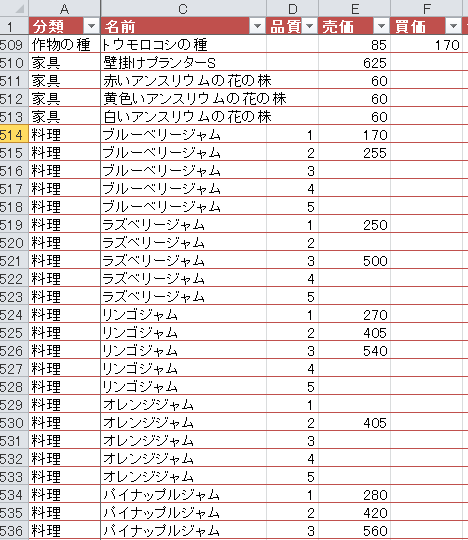 自分用に作ってる計算表。オーロラディナーの材料を品質2で作ったらどうなるのか。