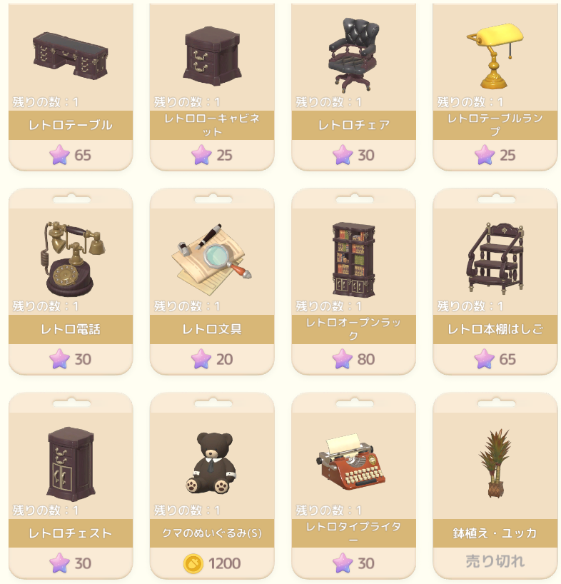 買いそびれがないか家具屋もチェックにきたら、おそらく開拓者Lv30で解放された区間に家具入ってました! わーここの存在わすれてた。そんな気はしたけど願い星ばっか😂😂😂 シャンデリアだけ購入して、あとは諦めw コインで買えるものは買いました(クマは既に2つ持ってる)