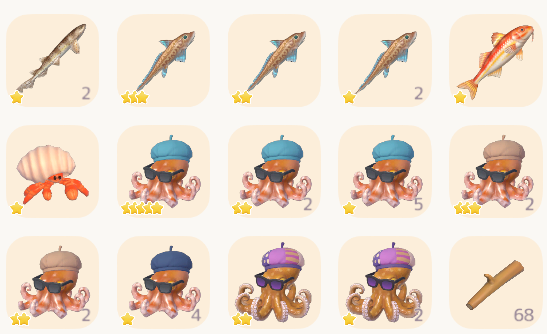 折良くヴァンニア主催の釣りクエストが来たので行ってみました! タコ率やっぱり少なめですね~。マーメイド装置4くらいと香水2使って、2ステージ分でこれだけでした。星5釣れたのは嬉しい~w 2ステージ目で柄帽のタコが釣れるのか、釣りやすいのか? 1ステージ目は釣れませんでした。
